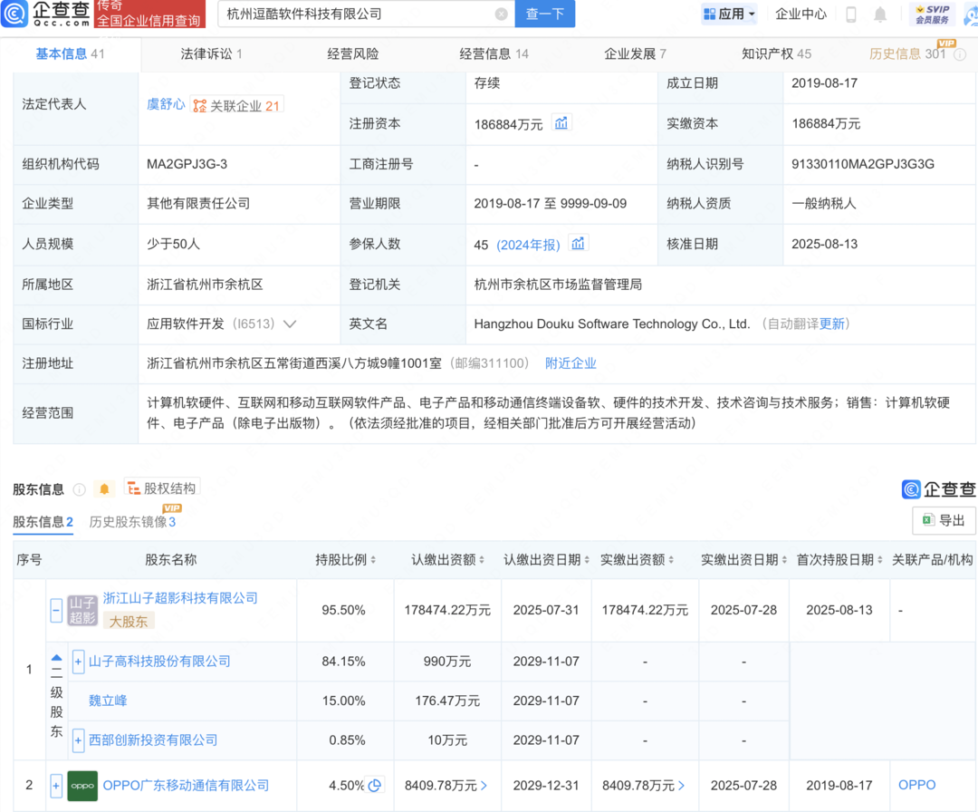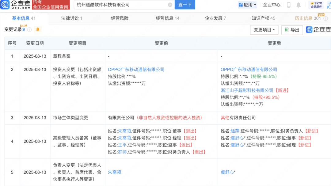企查查APP显示,近日,负责OPPO项目的杭州逗酷软件科技有限公司发生工商变更股市配资在线登录,新增山子高科旗下浙江山子超影科技有限公司为股东,持股95.5%,同时OPPO广东移动通信有限公司对该公司持股比例由100%降至4.5%。企查查信息显示,该公司成立于2019年,注册资本约18.69亿元,经营范围包含:计算机软硬件、互联网和移动互联网软件产品、电子产品和移动通信终端设备软、硬件的技术开发、技术咨询与技术服务等。